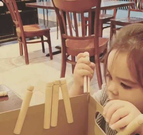Eren’in hareketi ve merakı arttıkça dışarıda yemek yiyeceğimiz zaman iki kez düşünür olduk🙈 Zira masada oturmak istemiyor, merakı onu nereye çekerse haliyle oraya büyülenmiş şekilde gidiyor, insanlarla iletişim kuruyor, onun için herkes saklambaç arkadaşı, bir yandan yemek istiyor ama o masanın arkasında ne var hemen onu da görmek istiyor vs. Biz de çoklukla yorucu bir maçtan çıkmış gibi hissediyoruz kendimizi. Ama bazen tesadüfen yanımızda onun ilgisini çekecek bir şeyler (genellikle oyuncak olmayan) oluyor ve işte o zaman keyifle yemeğimizi yiyip, hatta bir iki kadeh bir şeyler bile içebiliyoruz. Bu ahşap mandalları ve sepeti restorana girmeden hemen önce başka bir dükkandan almıştım. Bizim dışımızda sadece iki masanın olduğu alanda, gezdi, dolaştı, en son dış kapıyı zorlamaya başladığında aklıma torbadakiler geldi. Önce videodaki gibi oynadı, sonra boş sandalyeye dizdi, sonra hepsini öbür sandalyeye taşıdı vs. Zaman aktı gitti. Hepimiz karnımız tok kalktık masadan.