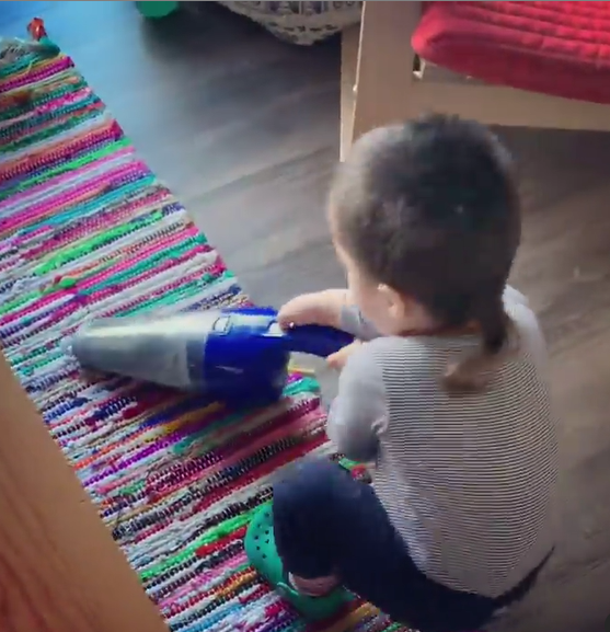 Videoda balkondaki kuş yemlerini salona taşıyan Eren’in yerleri süpürdüğü bir kesit izliyoruz😊. Montessori çocuğu diye illa ahşap saplı süpürgeyle süpürecek değil, çocuk teknoloji seviyor🙈